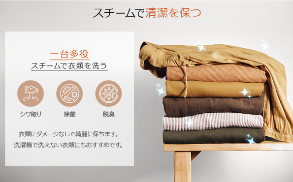 - ニオイケア: 子どもの服の食べこぼし臭、タバコ臭、冬のコートのニオイもスチームでケアできます。